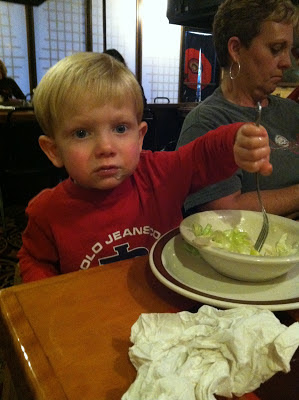 Last week, Granny CC and Pawpaw came to town for the weekend. Benton got to show off his new house and then we went to the local Japanese steakhouse for dinner. I'm not sure what he liked more: the aquarium, the fire or the fried rice. He ate everything. Including the soup and salad.